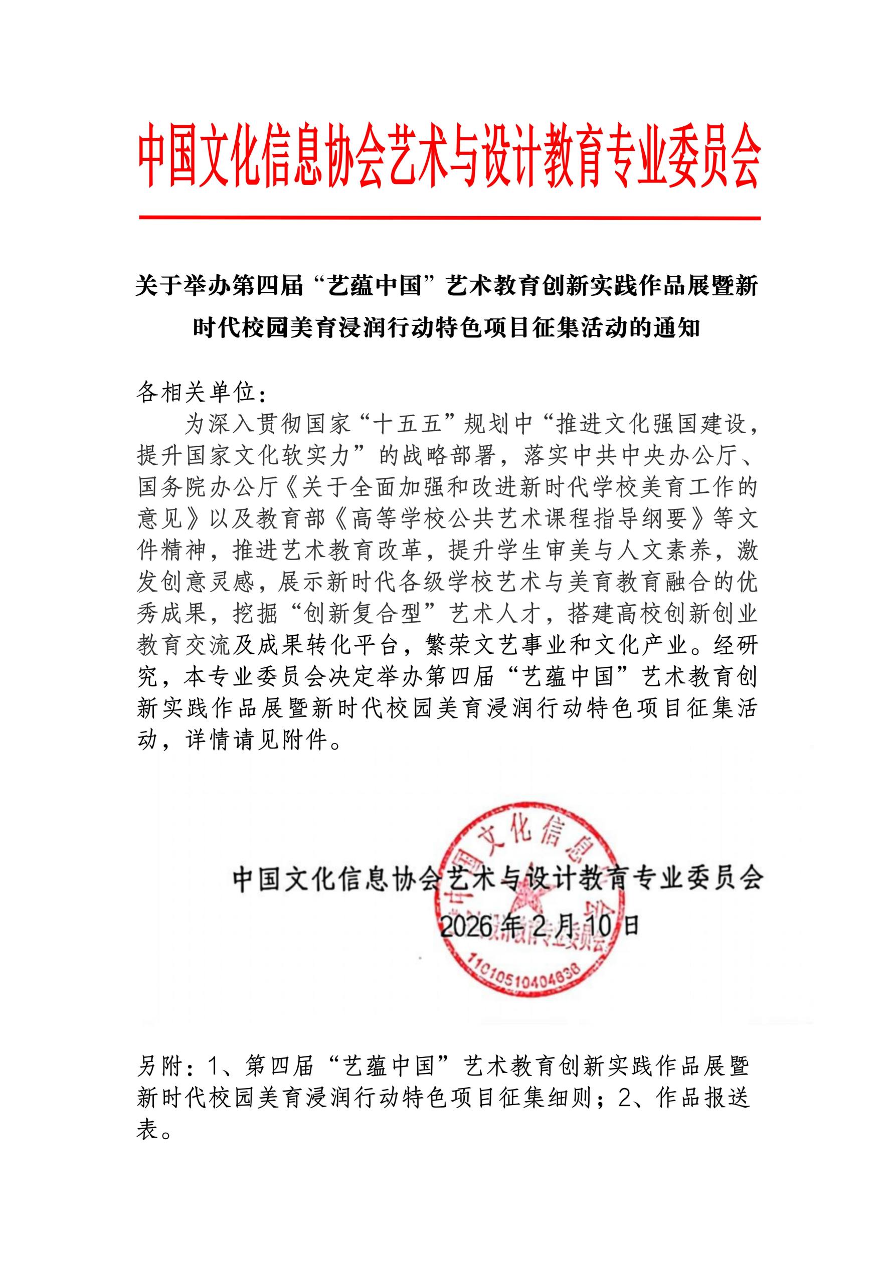 来源:网络信息部 关键字:第四届国艺展暨新时代校园美育浸润行动特色项目征集 日期:2026-03-10 点击:5193